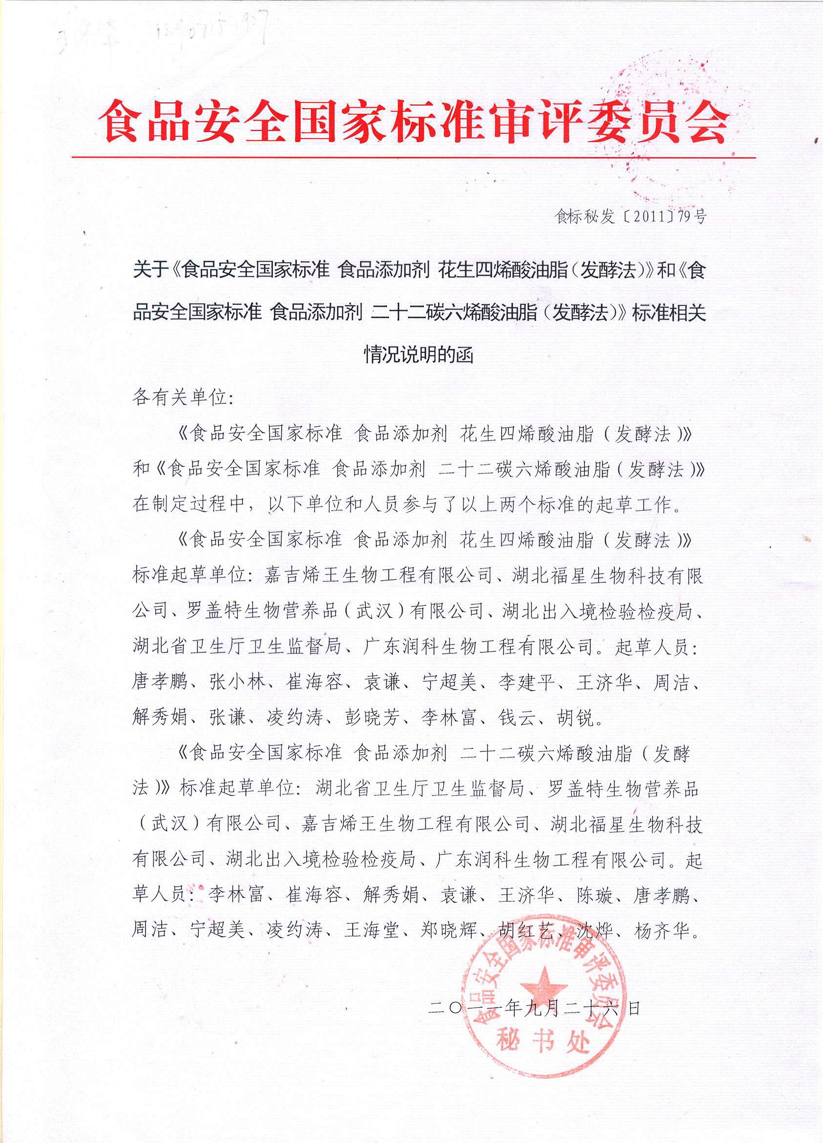 ?????? 潤(rùn)科生物參與相關(guān)產(chǎn)品國(guó)家級(jí)、行業(yè)級(jí)標(biāo)準(zhǔn)起草工作,這既是榮譽(yù)更是責(zé)任與鞭策!2011年9月,公司參與食品安全國(guó)家標(biāo)準(zhǔn)審評(píng)委員會(huì)的兩項(xiàng)國(guó)家標(biāo)準(zhǔn)《食品安全國(guó)家標(biāo)準(zhǔn) 食品添加劑 二十二碳六烯酸油脂(發(fā)酵法)》和《食品安全國(guó)家標(biāo)準(zhǔn) 食品添加劑 花生四烯酸油脂(發(fā)酵法)》的制定,已在行業(yè)中普及使用。