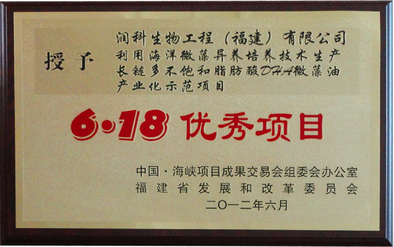 ??????? 潤科生物工程(福建)有限公司研發(fā)課題“利用海洋微藻異養(yǎng)培養(yǎng)技術(shù)生產(chǎn)長鏈多不飽和脂肪酸DHA微藻油產(chǎn)業(yè)化示范項(xiàng)目”被福建省發(fā)改委授予618優(yōu)秀項(xiàng)目。