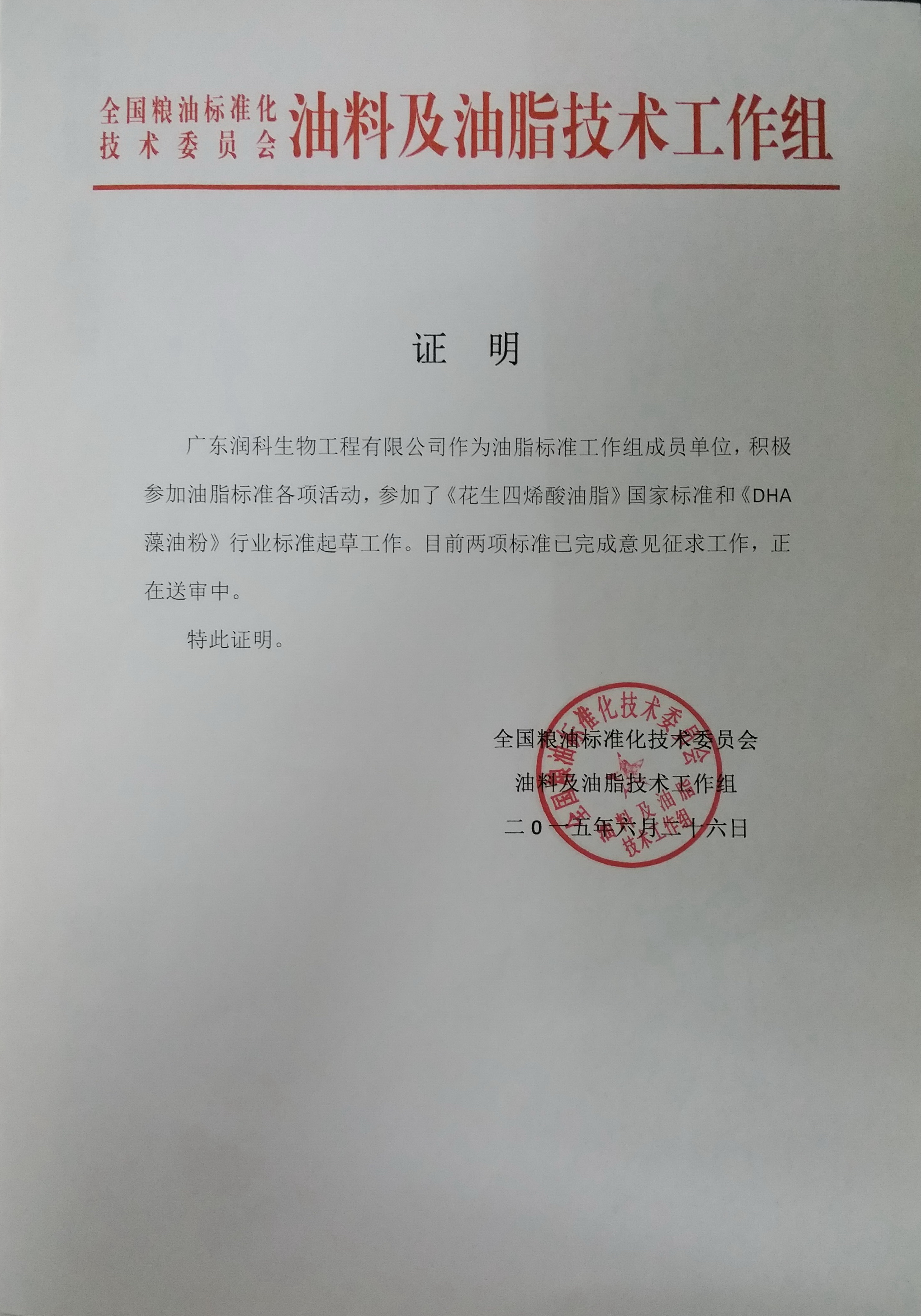 ???????2015年6月,公司參與全國(guó)糧油標(biāo)準(zhǔn)化技術(shù)委員會(huì)油料及油脂分技術(shù)委員會(huì)的《花生四烯酸油脂》國(guó)家標(biāo)準(zhǔn)和《DHA藻油粉》行業(yè)標(biāo)準(zhǔn)起草工作。