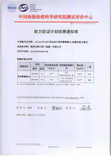 ? ? ? ?潤(rùn)科生物中心實(shí)驗(yàn)室檢測(cè)水平不斷提升,積極參加中國(guó)檢驗(yàn)檢疫科學(xué)研究院測(cè)試評(píng)價(jià)中心開展的能力驗(yàn)證計(jì)劃,累計(jì)已參與了菌落總數(shù)、黃曲霉毒素B1、鉛、大腸菌群、酸價(jià)、過氧化值、霉菌和酵母計(jì)數(shù)等多項(xiàng)指標(biāo)檢測(cè)能力驗(yàn)證,驗(yàn)證評(píng)價(jià)結(jié)果均為滿意。