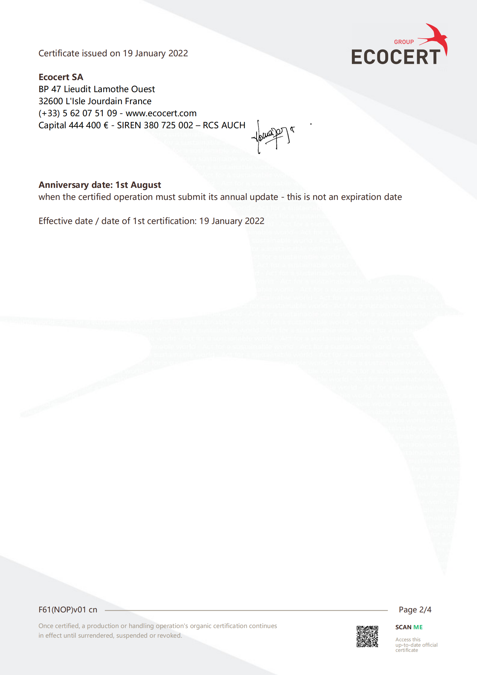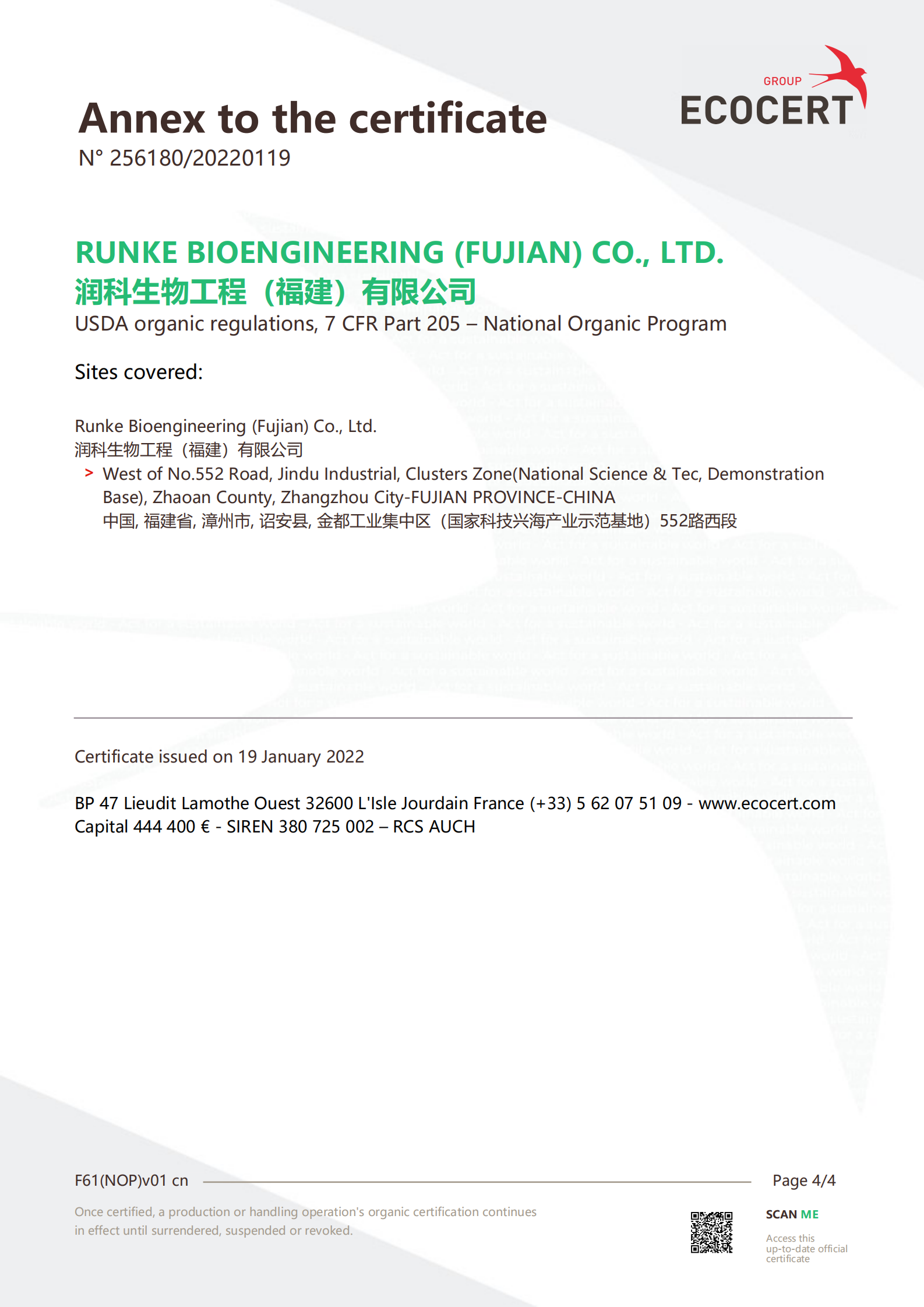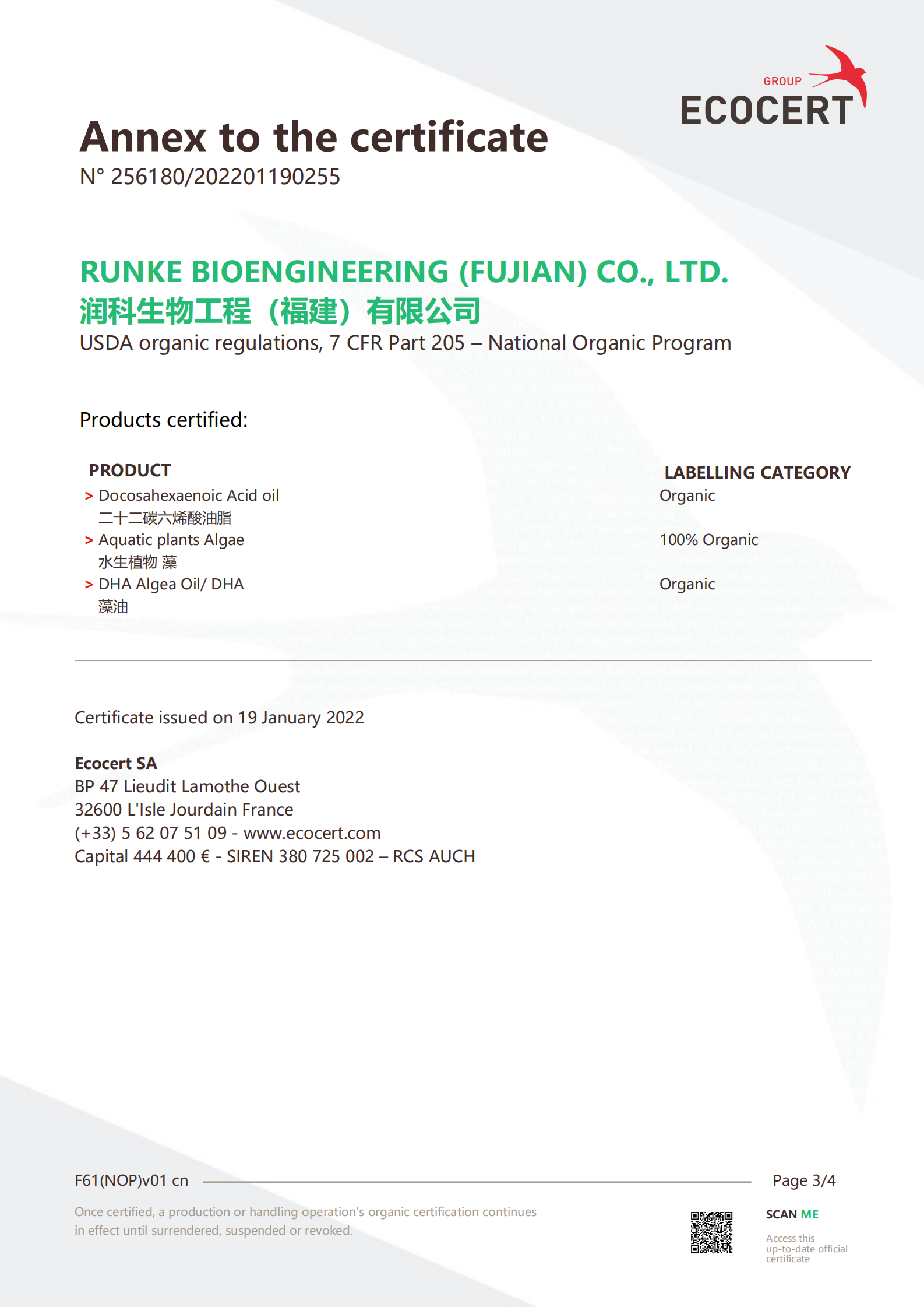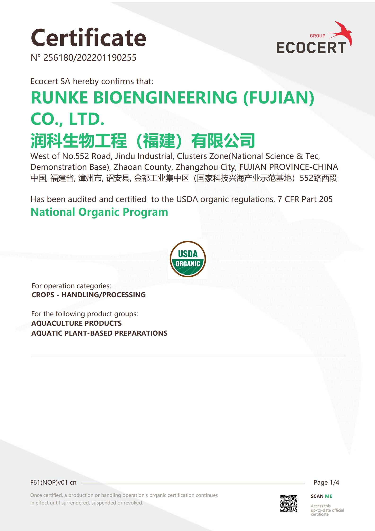 2022年1月19日,潤科生物工程(福建)有限公司收到法國國際生態(tài)認證中心(ECOCERT SA)關于潤科生物“二十二碳六烯酸油脂”、“水生植物海藻”、“DHA 藻油”產品通過美國有機認證的通知,這意味著,潤科生物DHA 藻油產品拿到了通往國際市場的有機食品領域的通行證。